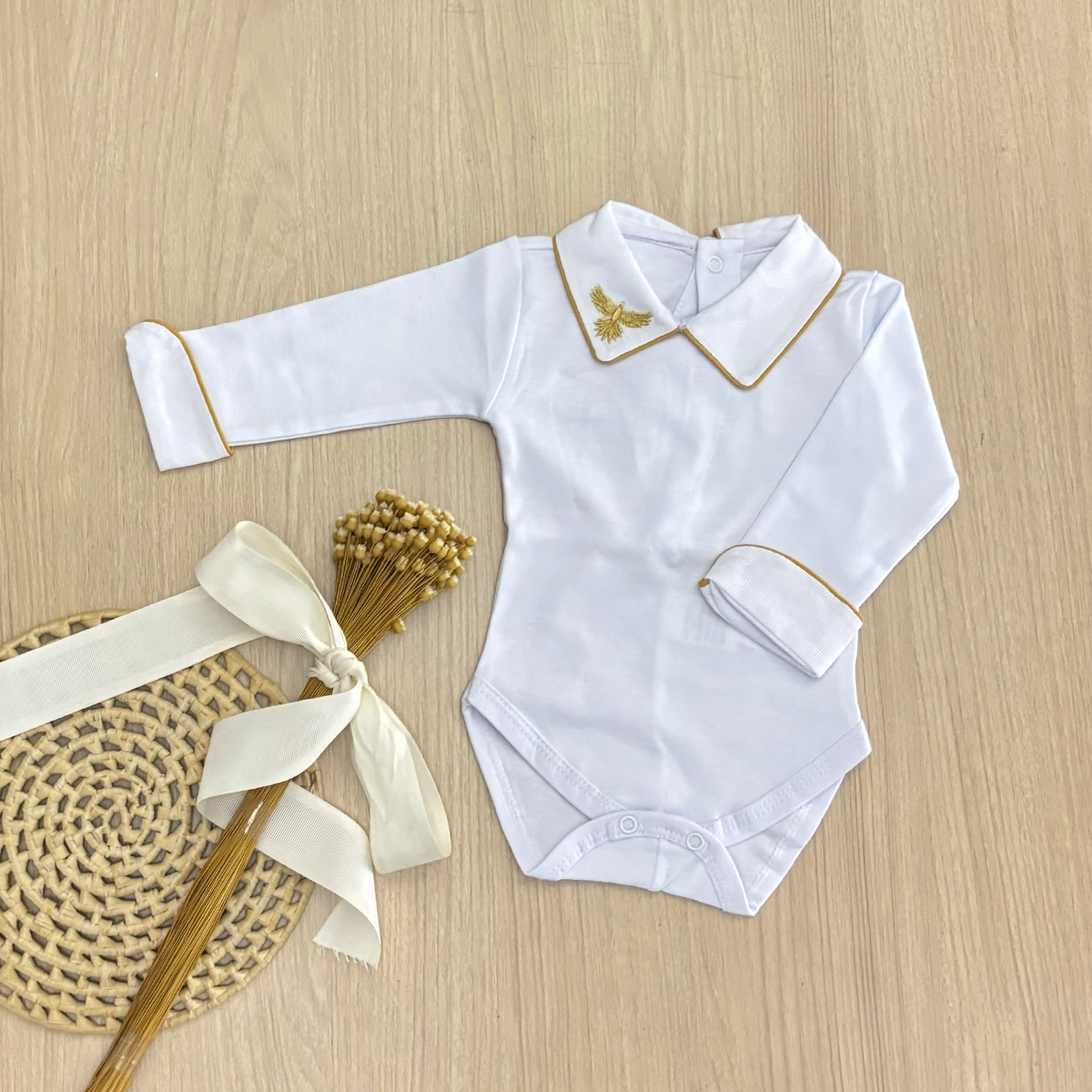 Body para bebê confeccionado em malha macia, ideal para proporcionar conforto e delicadeza nos primeiros momentos. Possui gola com acabamento refinado e bordado delicado, tornando a peça perfeita para ocasiões especiais como batizado.