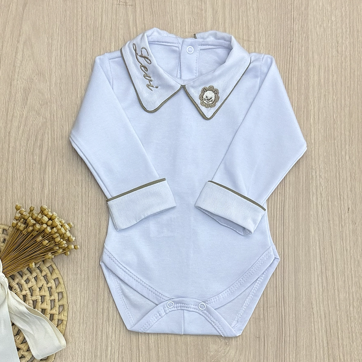 Body para bebê confeccionado em malha macia, proporcionando conforto e delicadeza para os primeiros momentos. Possui gola com acabamento refinado, com detalhe bordado de leão e possibilidade de personalização com nome, trazendo exclusividade à peça.