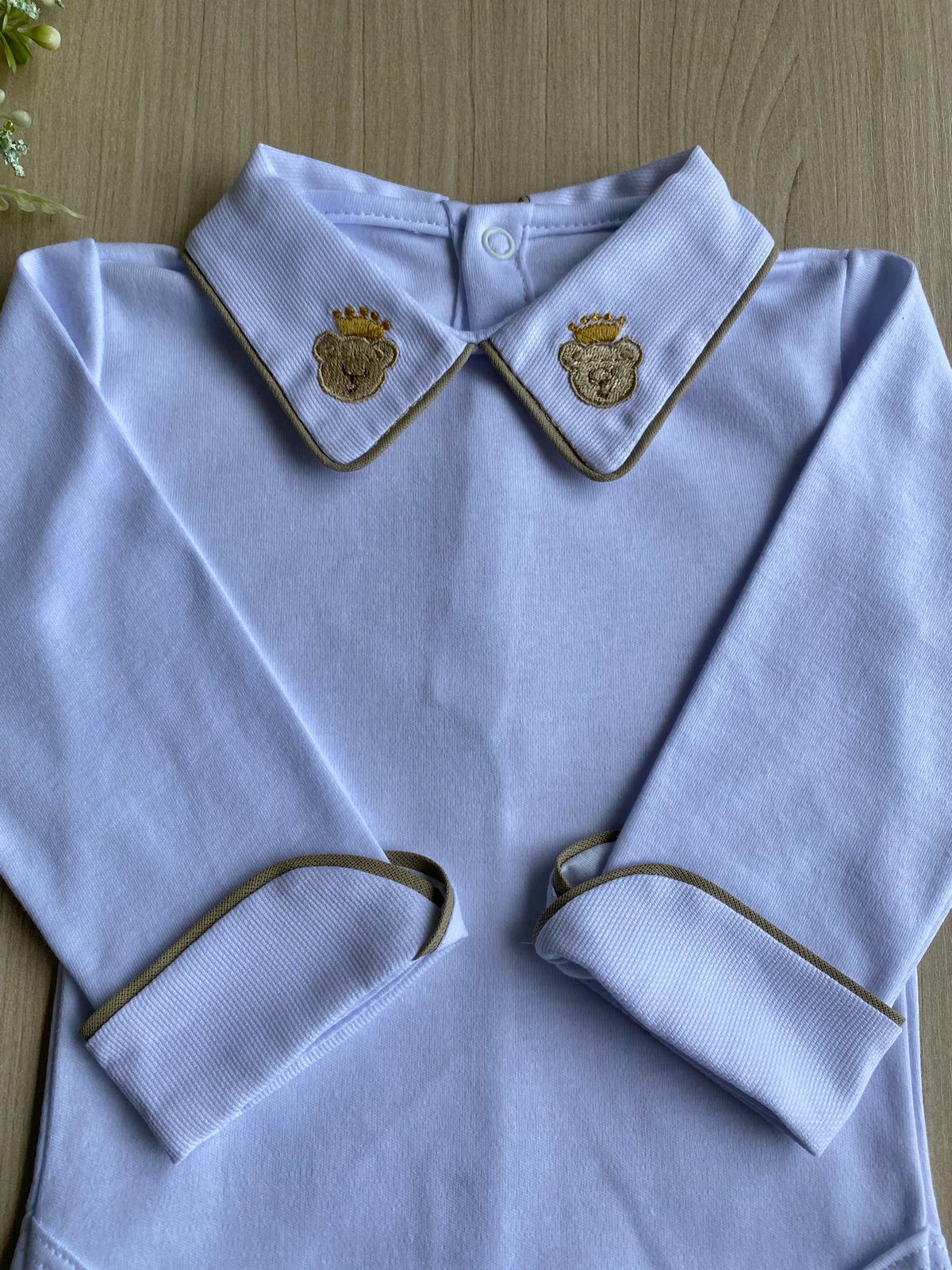 Body camisa branco com golas e punhos 100% algodão bordado de urso principe com abotoamento entre as pernas.