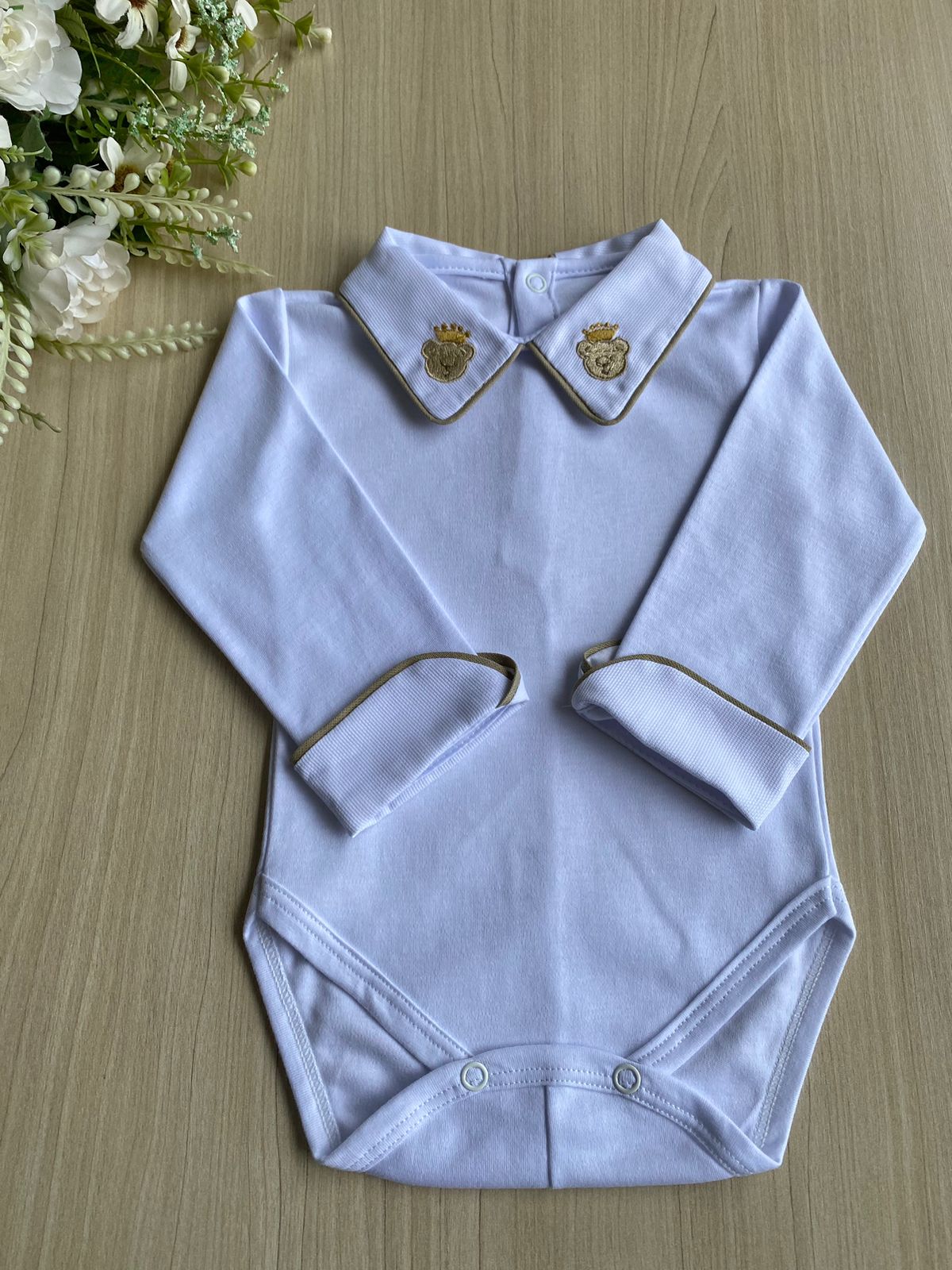 Body camisa branco com golas e punhos 100% algodão bordado de urso principe com abotoamento entre as pernas.