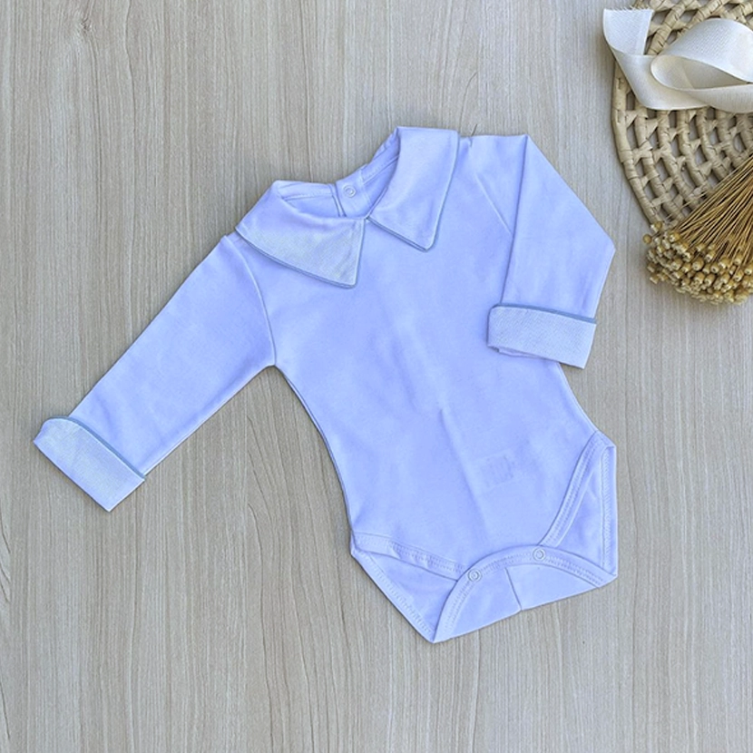 Confeccionado em tecido macio, respirável e delicado, o body é indicado para a pele sensível do recém-nascido, garantindo bem-estar durante todo o uso. A gola tradicional com acabamento em pesponto contrastante traz um visual clássico e sofisticado, enquanto os punhos dobráveis oferecem ajuste confortável e proteção térmica.