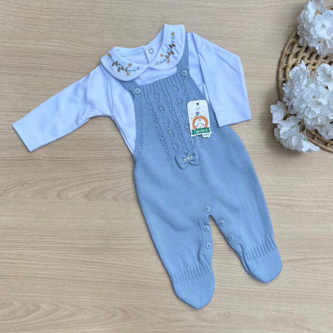 Composta por jardineira em tricot com detalhes em relevo, aplicação de pérolas delicadas e lacinho frontal, acompanha body manga longa com gola bordada floral, trazendo charme e sofisticação ao look.
