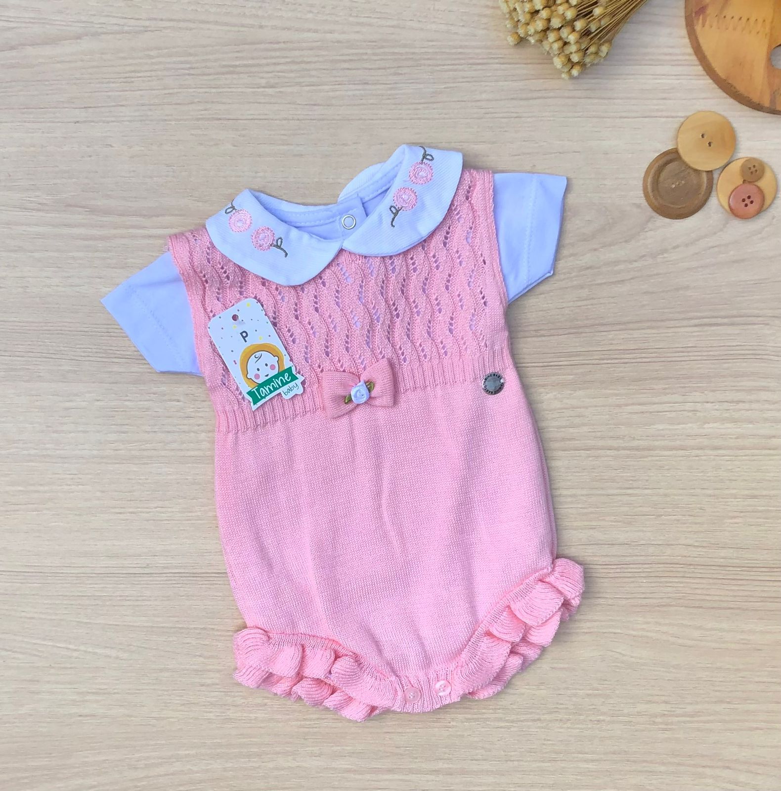 Macacão curto em tricot com desenho rendado, detalhe em laço e fechamento por botões na parte inferior