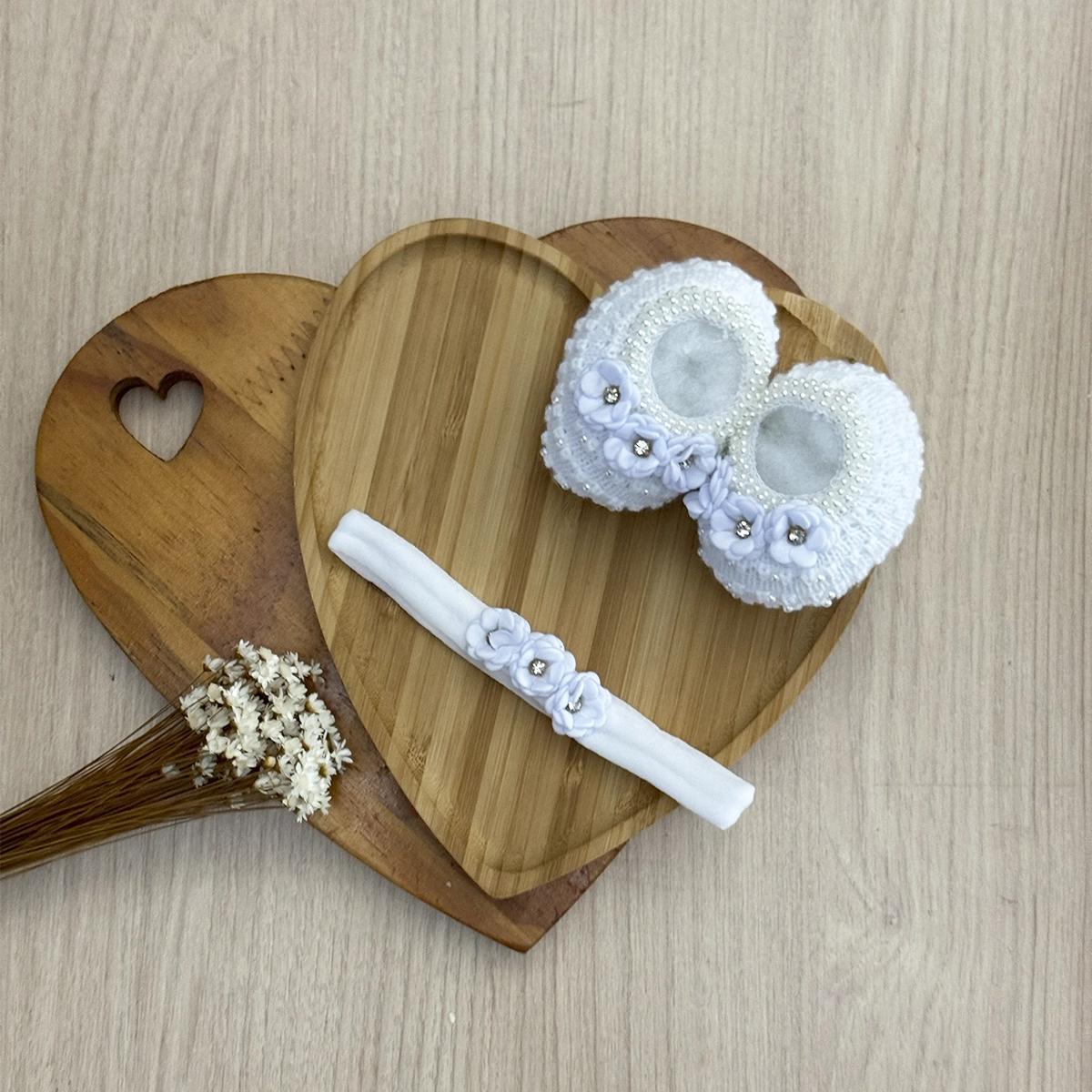 Kit composto por sapatinho e faixa de bebê, desenvolvido com acabamento delicado e aplicação de flores.