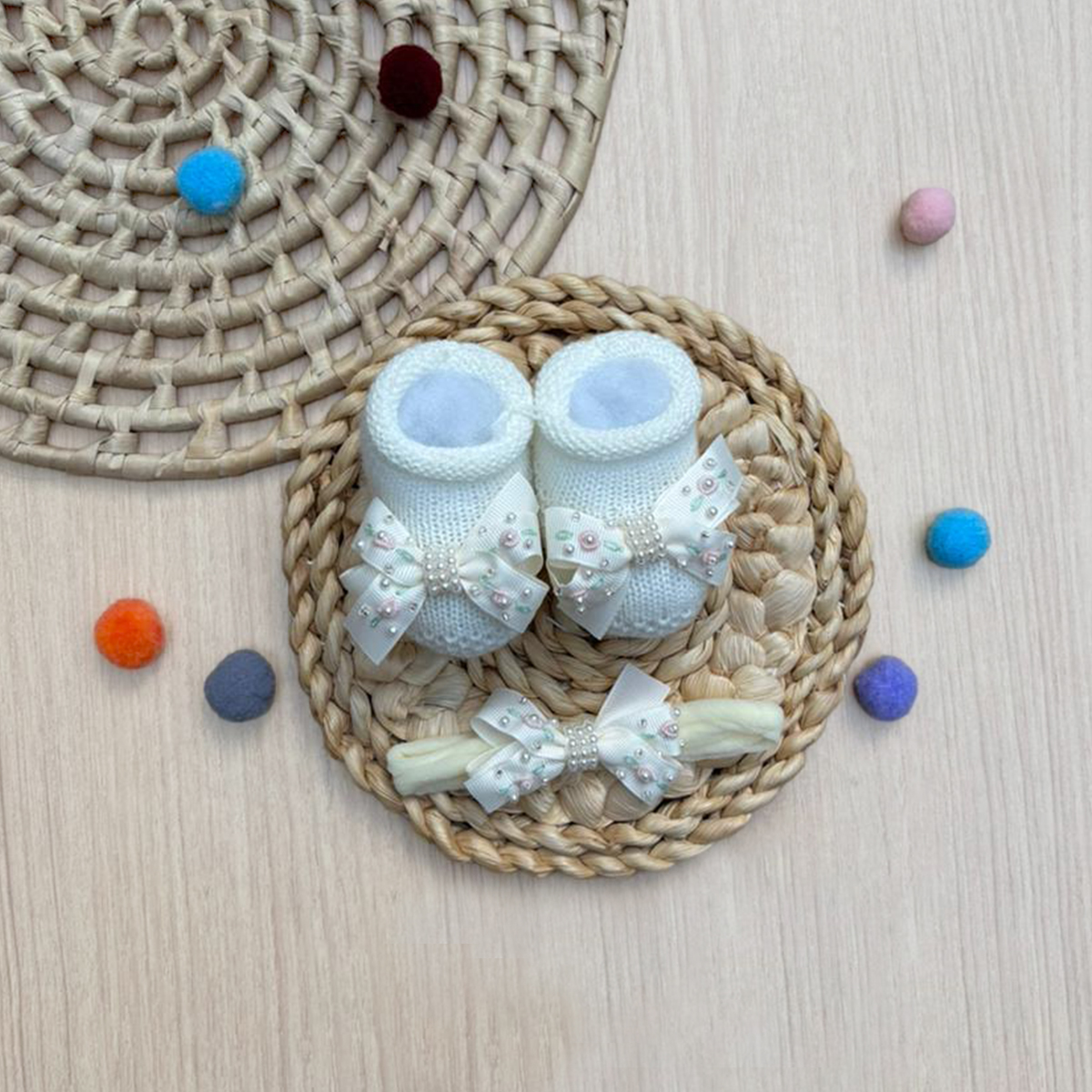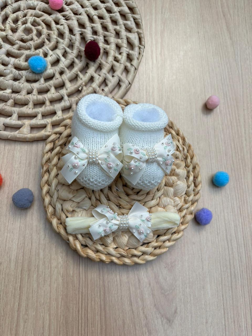 Composto por sapatinho em tricot macio e faixa para cabelo combinando, o conjunto possui laço com detalhes delicados, garantindo um visual elegante e encantador para qualquer ocasião.