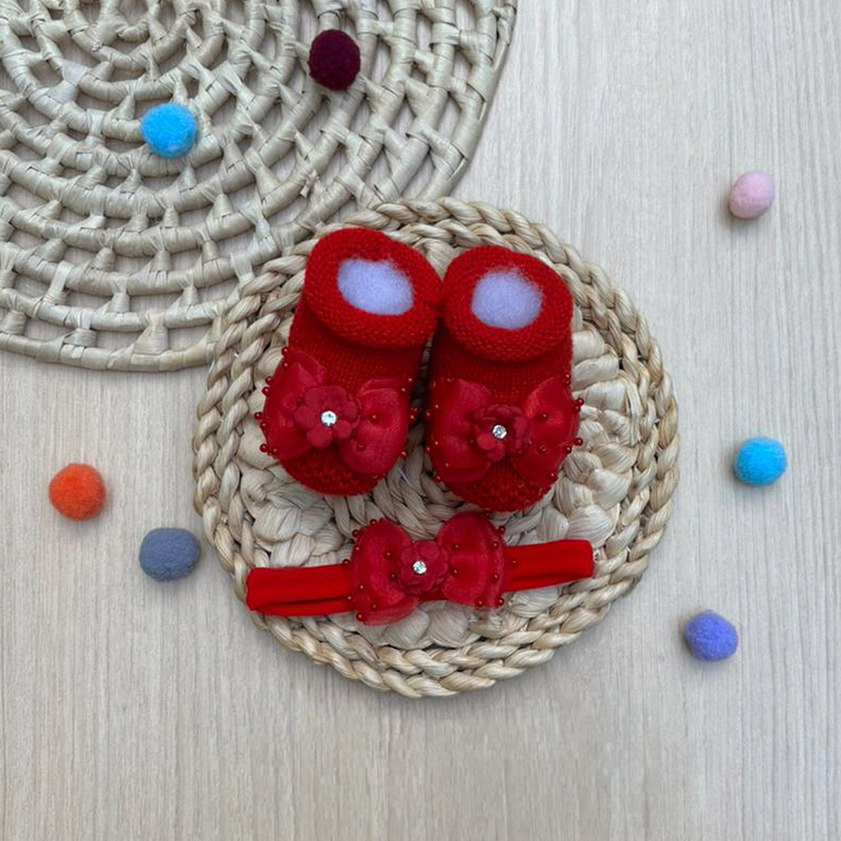 Composto por 2 peças, sendo sapatinho em tricot macio e faixa de cabelo combinando, o conjunto possui laço com flor e detalhes em pérolas que destacam a cor vermelha vibrante da peça.