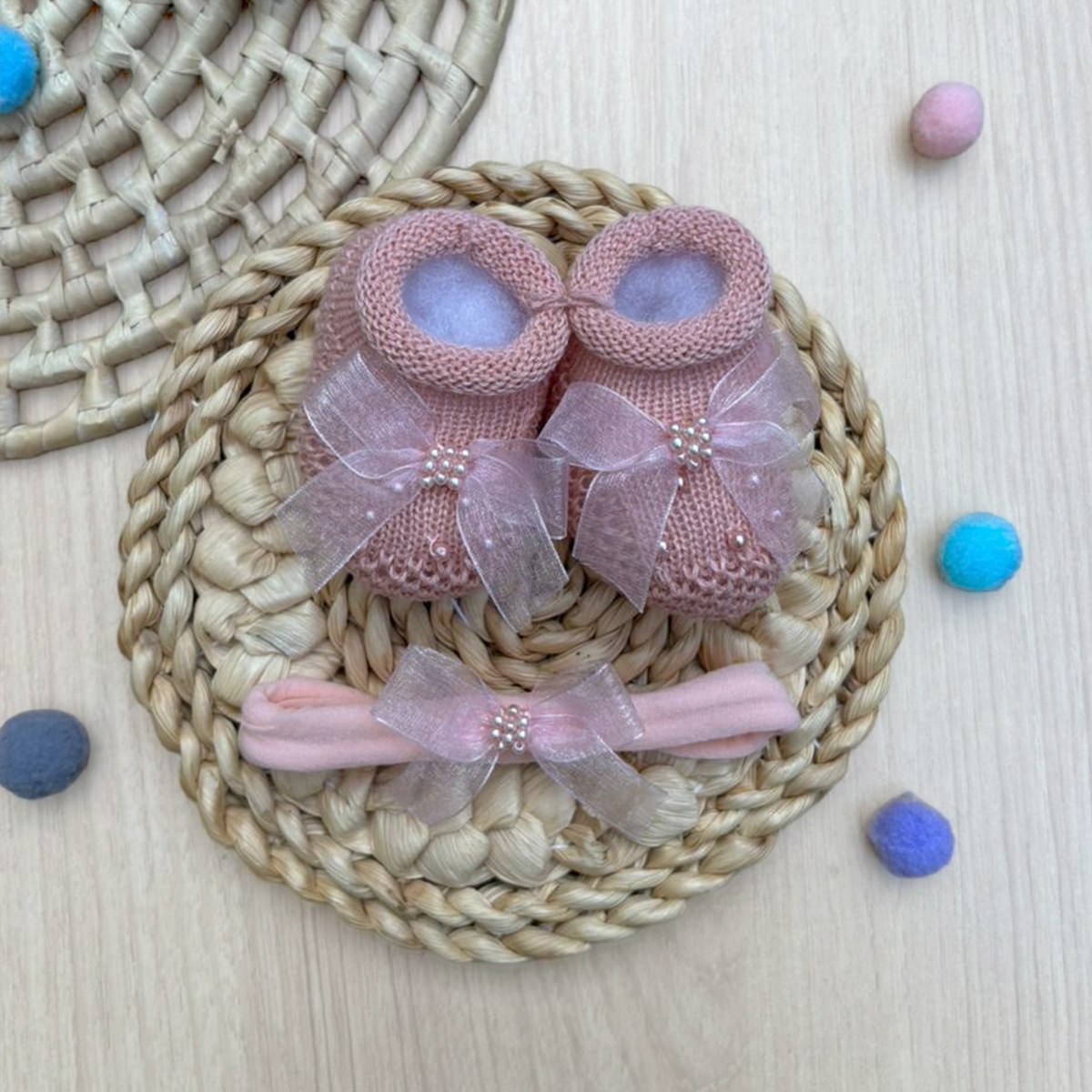 Composto por 2 peças, sendo sapatinho em tricot macio e faixa para cabelo combinando, o conjunto possui laço em renda leve com detalhes em pérolas, proporcionando um visual elegante para ocasiões especiais.