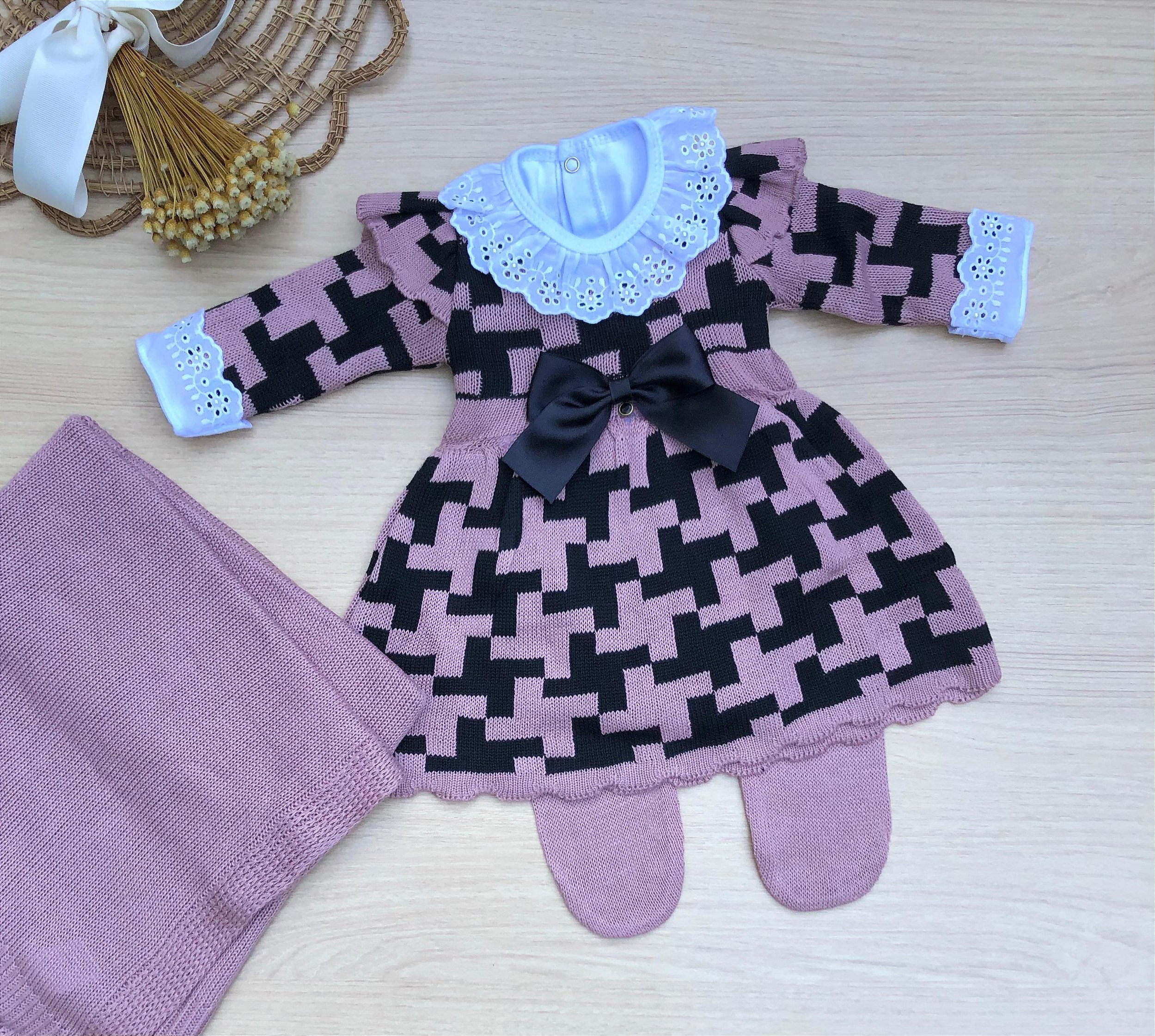 O vestido possui gola em bordado inglês, mangas com detalhes rendados e um laço central que completa o visual com charme. A calça integrada garante praticidade e conforto, enquanto a manta coordenada em tricot oferece aconchego e harmonia ao conjunto.