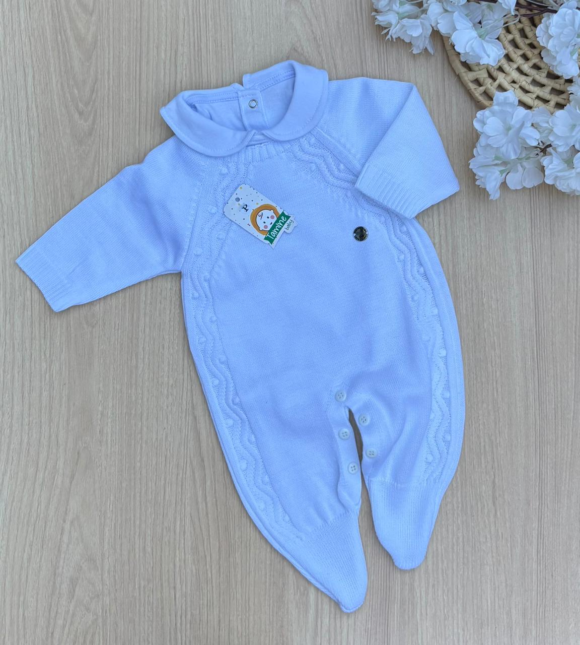 - Macacão de linha anti-alérgica, com abotoamento entre as pernas e nas costas para facilitar a troca do bebê, com pezinho fechado medindo 49cm do ombro aos pés