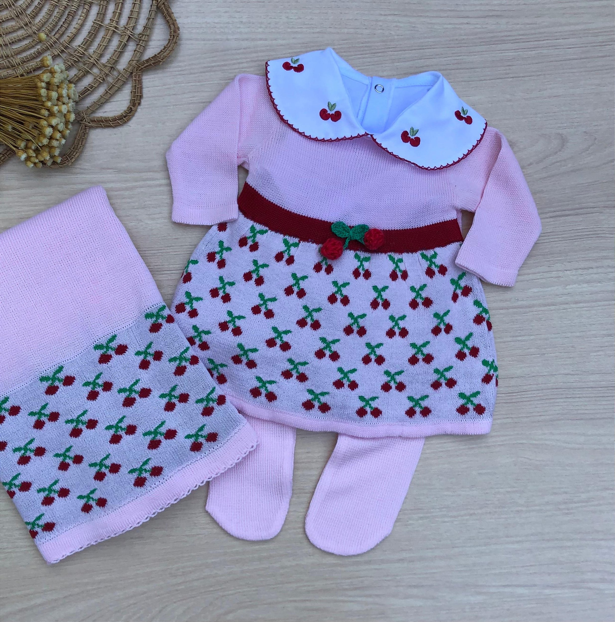 Produzida em tricot macio e antialérgico, a peça possui vestido em tom rosa com estampa de cerejinhas e aplicação de lacinho na cintura, gola bordada e acabamento refinado. A manta coordenada repete o mesmo padrão de cerejinhas, formando um conjunto harmonioso e cheio de personalidade.