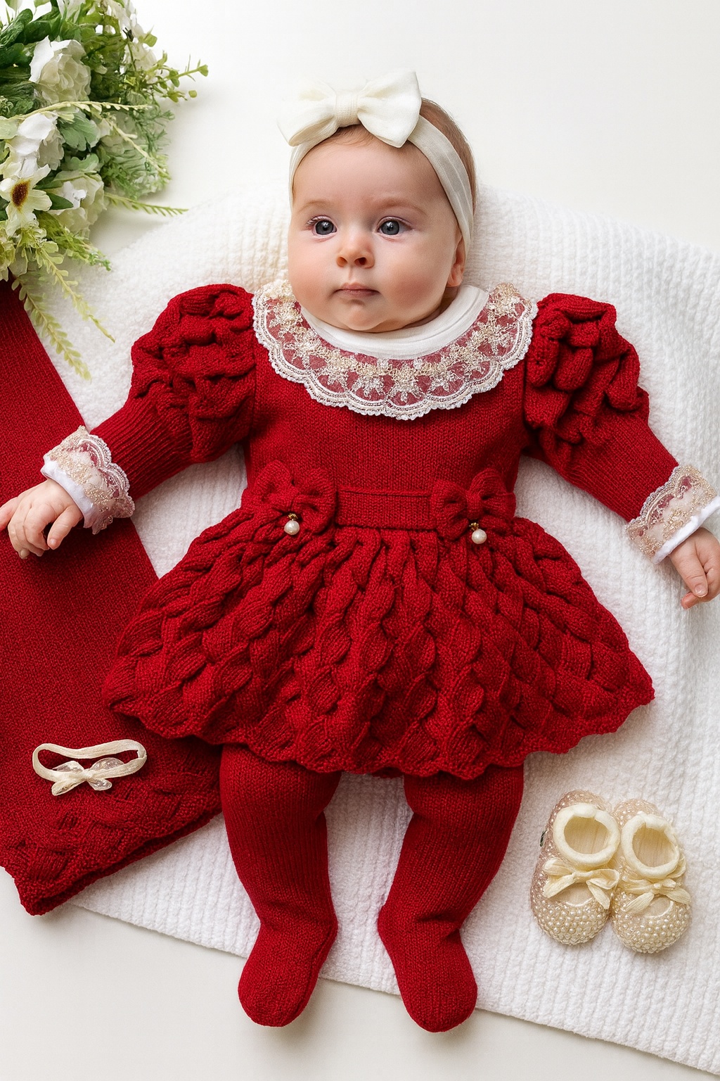 Conjunto de saída de maternidade lindo em tricot, sintetiza toda delicadeza que a sua menina merece para esse momento especial! O conjunto de tricot é confeccionado para trazer bem estar para a pequena, sem abrir mão do estilo. O vestidinho de tricot com ricos detalhes chama atenção com sua composição romântica e ainda acompanha acessórios únicos e lindos. A combinação fica perfeita!