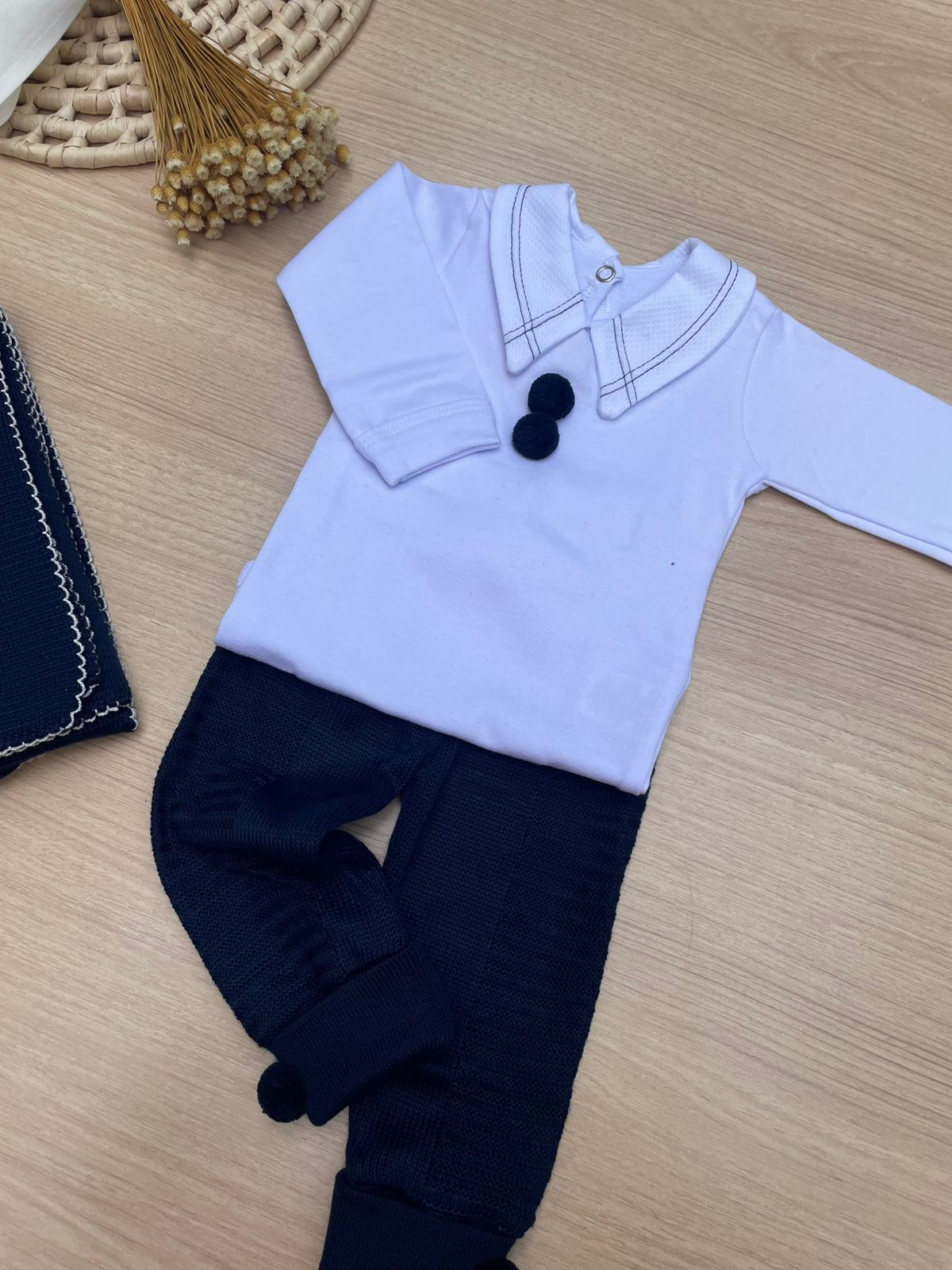 O body possui uma uma abertura entre as pernas para facilitar a troca da fralda, além de possuir gola e dois pompons assim como na barra da calça, a calça totalmente em tricô, possuí elástico na cintura e na barra para melhor vestir. A manta ajudará a manter o bebê protegido e quentinho.