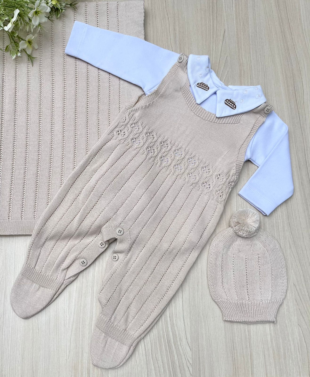 Que tal escolher um conjunto com o aconchego clássico do tricot e uma proposta elegante para os primeiros dias do bebê? Esse é o conjunto Joca, exelente opção para saída de maternidade, seu bebê vai ficar lindão!