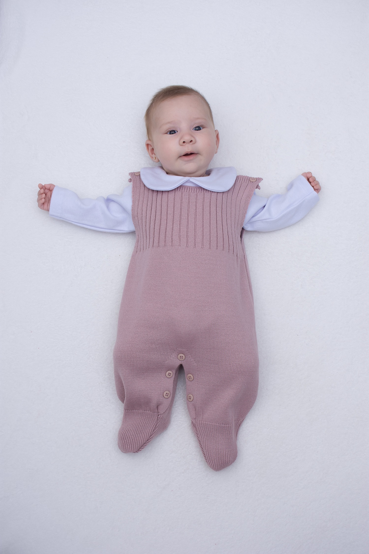 O conjunto é composto por jardineira em tricot com pezinho e body manga longa com gola polo, formando um look clássico e delicado para recém-nascidos.