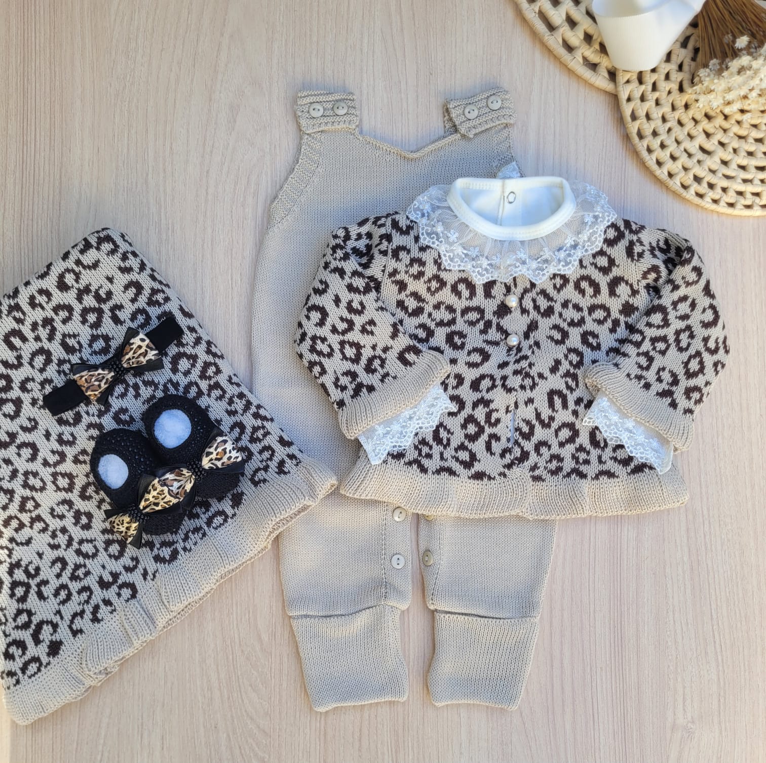 Saída de maternidade de menina estampa de onça 6 peças em tricot, modelo lindo para a sua princesinha arrasar com o primeiro look, casaco com estampa de onça e babado rosê, salopete rosê e manta com estampa de onça e babado em rosê, modelo campeão de vendas!