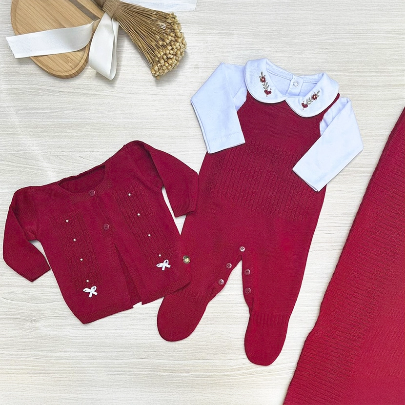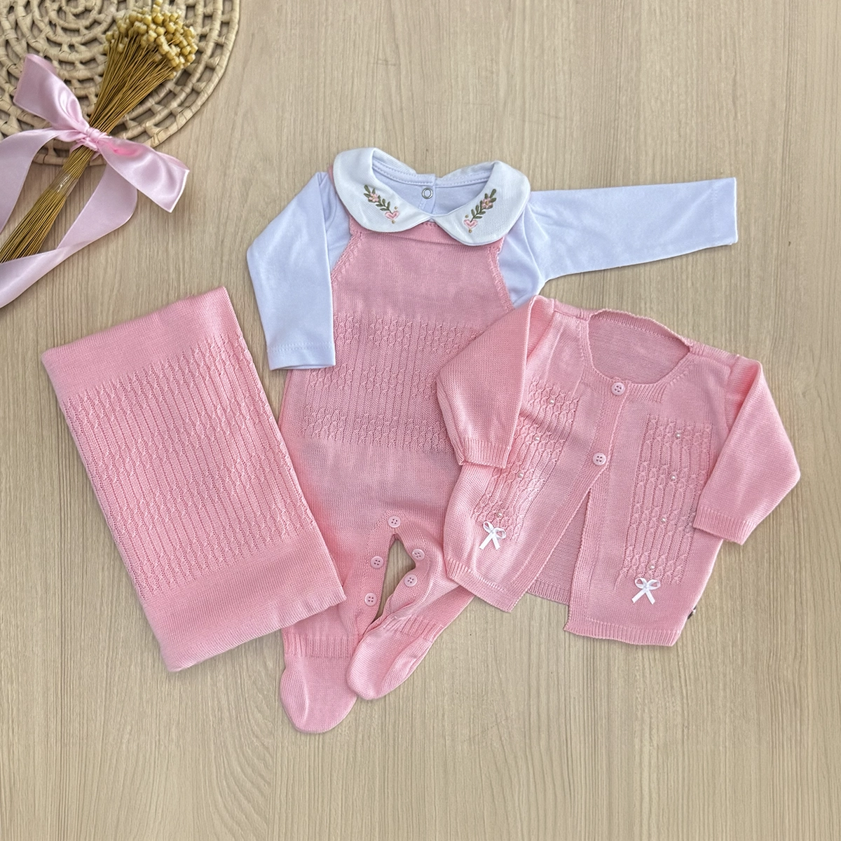 O macacão em tricot possui detalhes trabalhados e fechamento funcional, facilitando a troca. O body manga longa com gola bordada acrescenta charme e sofisticação ao visual. O casaco em tricot complementa o conjunto com aconchego e elegância, enquanto a manta combinando é ideal para envolver a bebê com conforto e segurança.