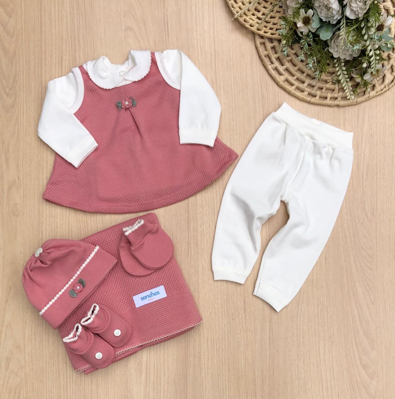 O vestido em tricot rosê, com detalhe bordado no peito, transmite suavidade e delicadeza. A calça branca complementa o look com conforto e leveza, enquanto a manta coordenada em tricot garante aconchego e estilo. O gorro, as luvas e os sapatinhos completam o conjunto, mantendo o bebê quentinho e protegendo do frio com charme e sofisticação.