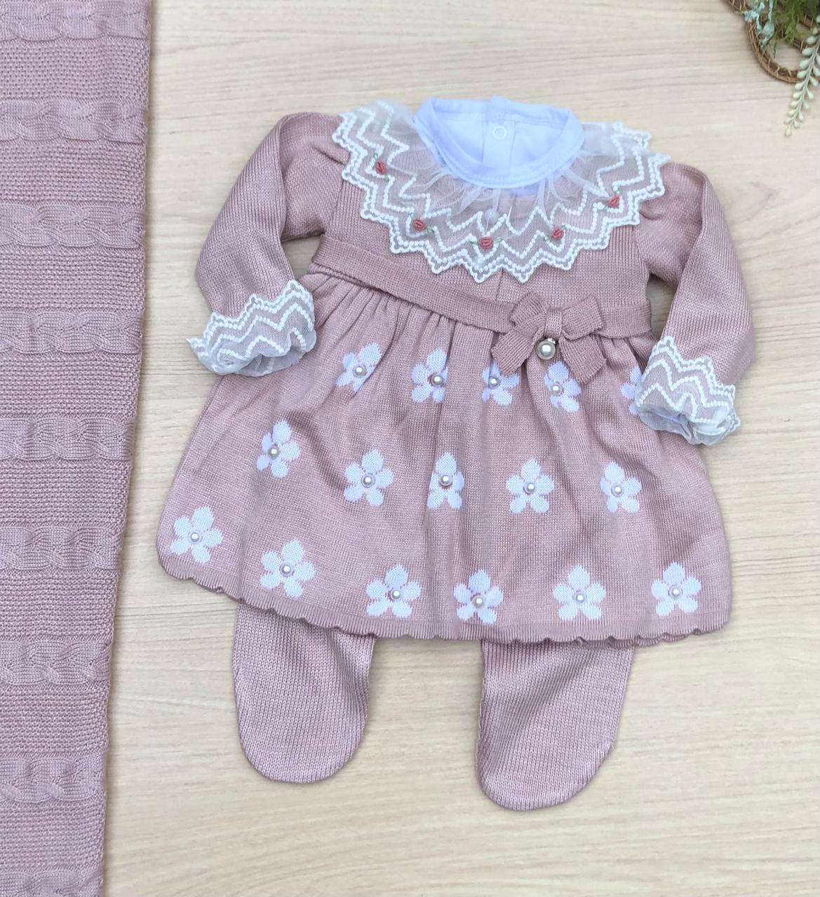 Cada detalhe foi pensado com amor: o vestido em tricot azul com flores aplicadas, o laço rosa com pérola, a gola rendada e a manta coordenada formam uma composição perfeita para a chegada da sua princesa.