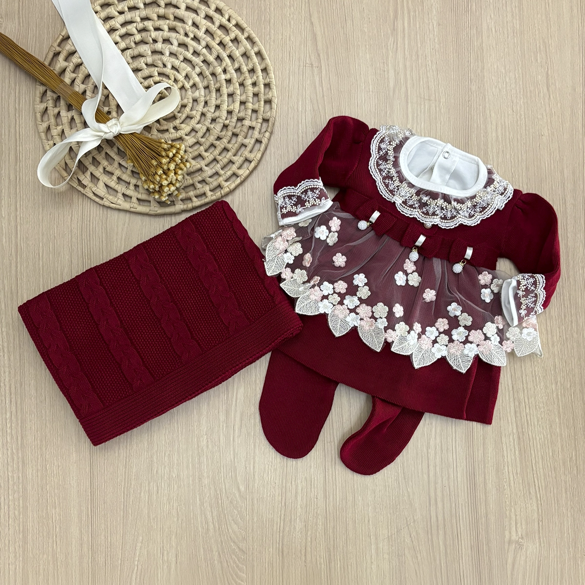 Saída de maternidade menina composta por 4 peças, desenvolvida em tricot com detalhes em renda dourada, proporcionando um visual delicado e elegante