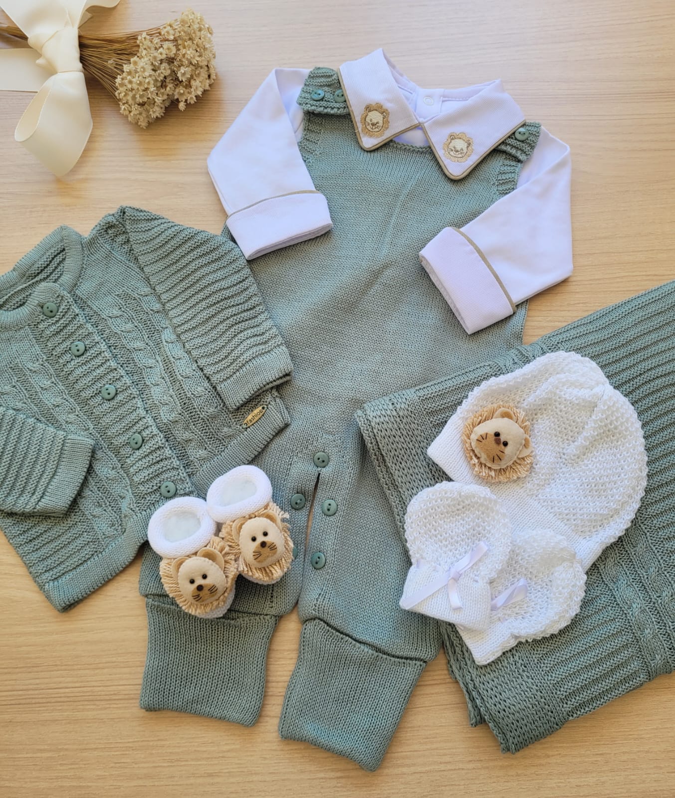 Prepare-se para encantar com esta charmosa Saída de Maternidade Tricot com Tema de Leãozinho, pensada especialmente para os primeiros momentos do seu bebê com muito conforto, estilo e carinho. O conjunto inclui um macacão jardineira em tricot com body de gola bordada com carinhas de leão, casaquinho com tramas delicadas, manta combinando, touca e sapatinhos em tricot com apliques de leãozinho, além de um par extra de luvinhas brancas.