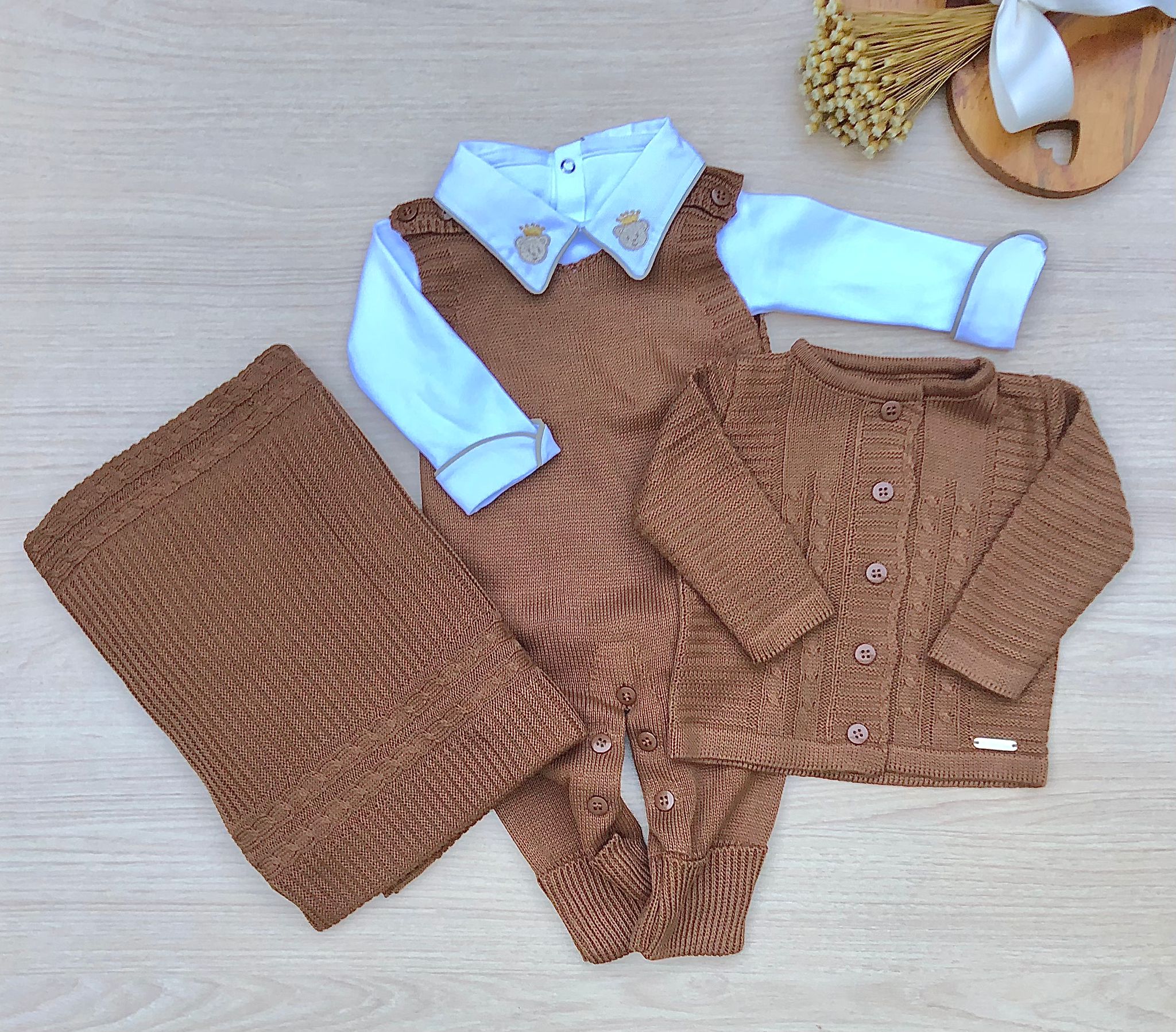 Apresentamos essa encantadora saída de maternidade em tricot, ideal para os primeiros dias de vida com muito conforto e estilo. O conjunto é composto por: