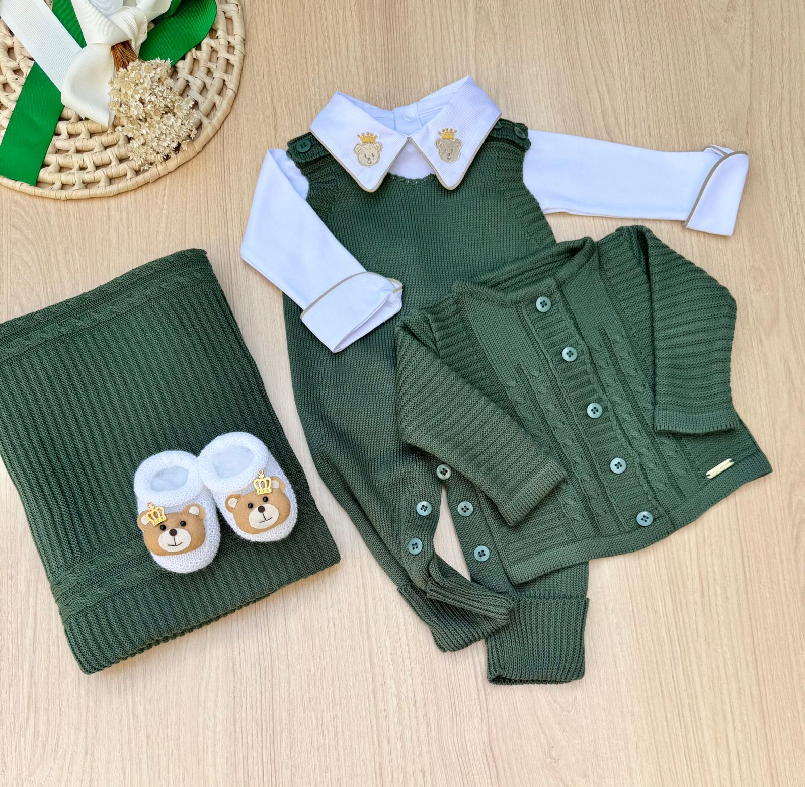 Apresentamos essa encantadora saída de maternidade em tricot, ideal para os primeiros dias de vida com muito conforto e estilo. O conjunto é composto por: