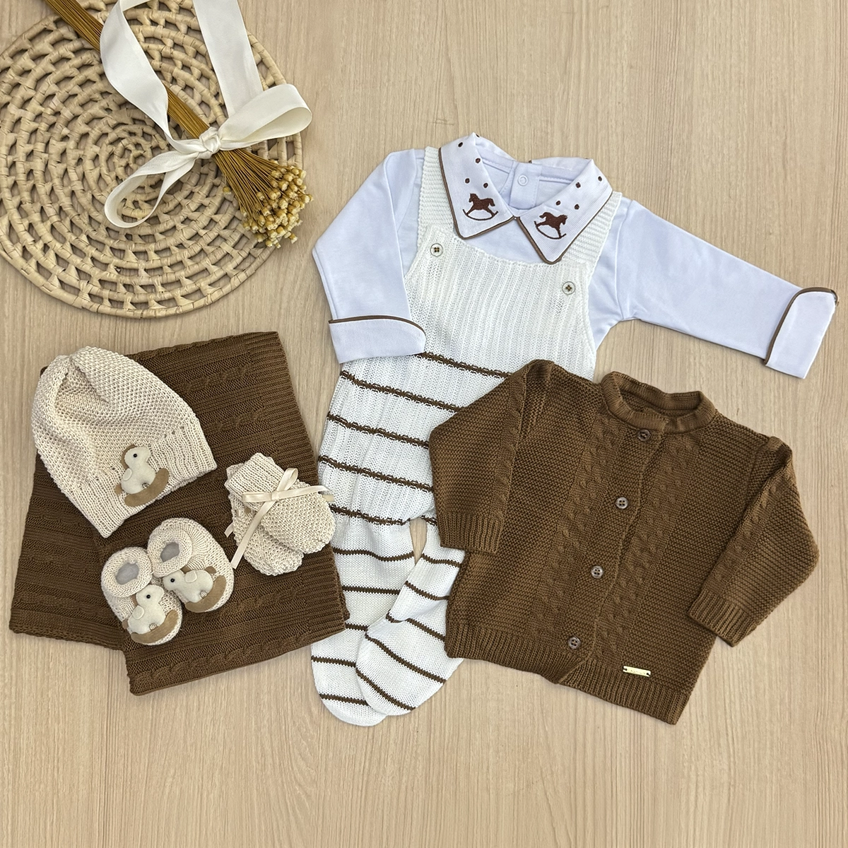 Saída de maternidade menino composta por 7 peças, desenvolvida em tricot com acabamento delicado e combinação de cores clássicas.