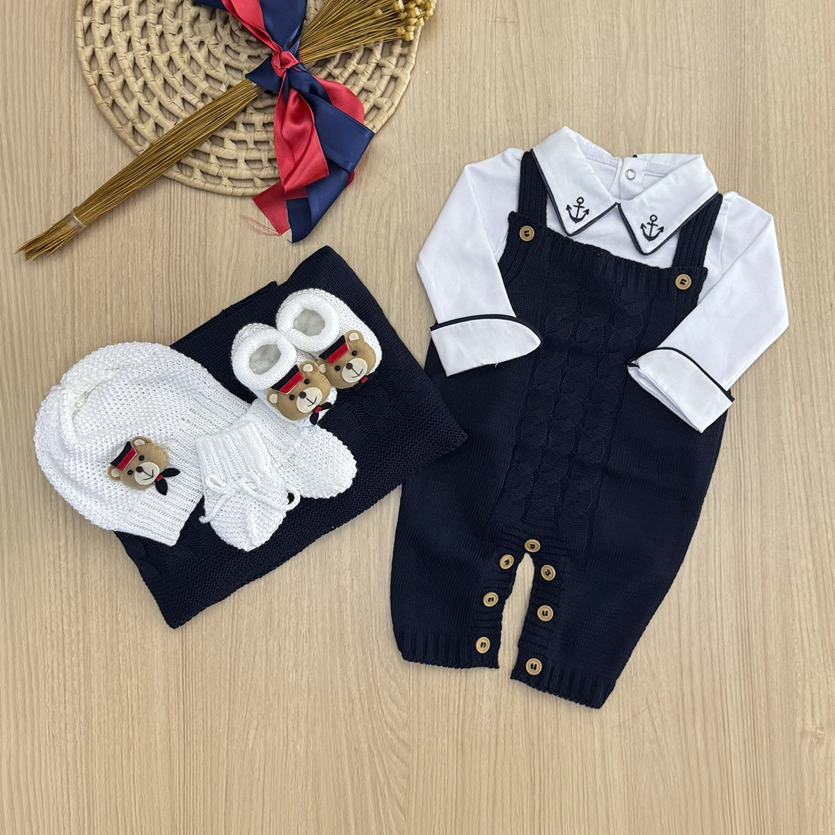 Que tal escolher um conjunto com o aconchego clássico do tricot e uma proposta elegante para os primeiros dias do bebê? Esse é o mood da Saída Maternidade Tricot Conjunto Clássico Jardineira.