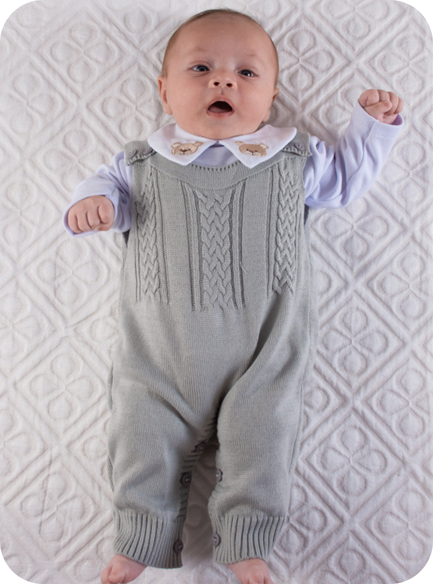 - Macacão/Jardineira de linha anti-alérgica, cavado, com abotoamento no ombro para facilitar a troca do bebê, com pezinho aberto medindo 42cm do ombro aos pés.