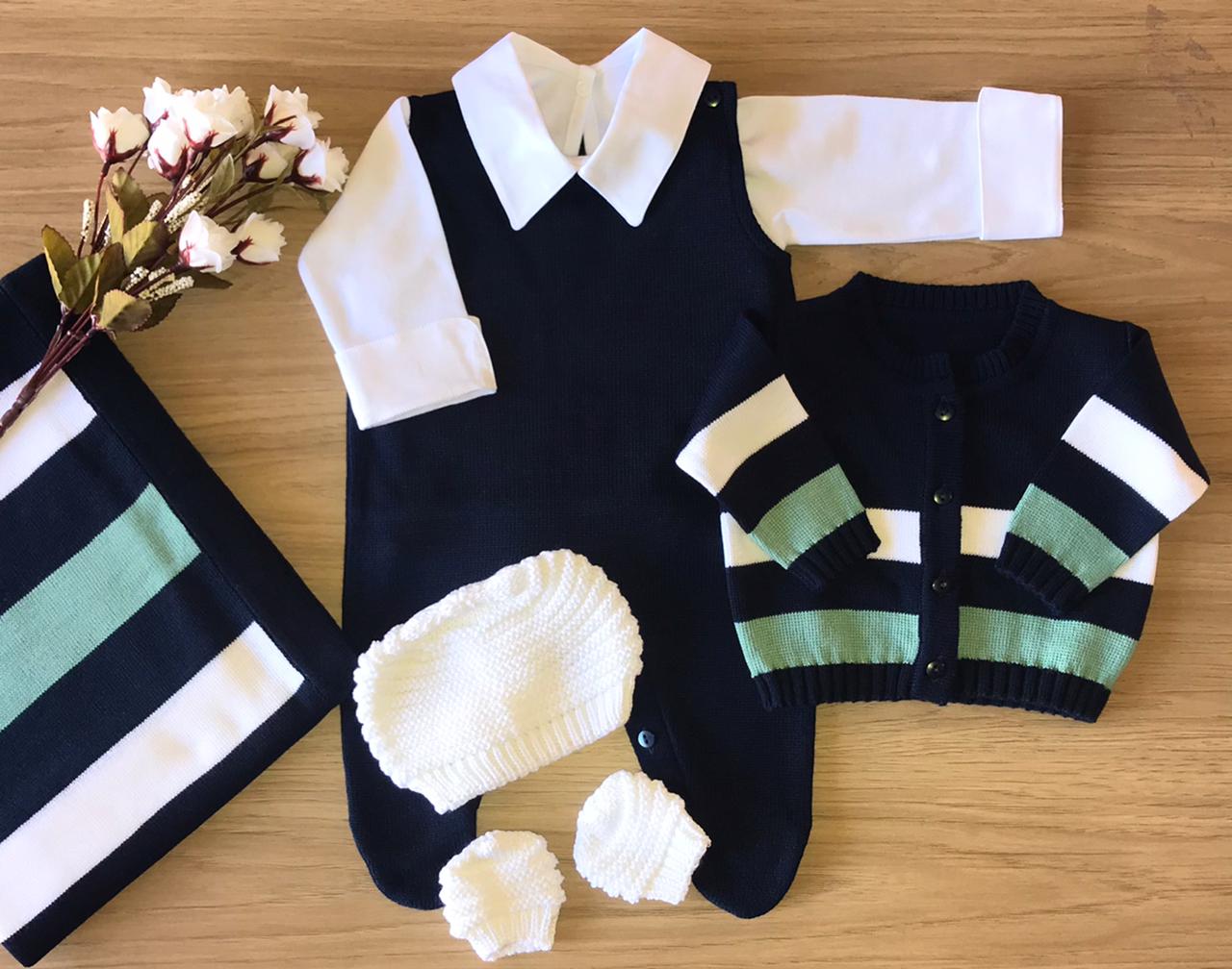 A saída de maternidade azul é uma das cores mais usada para os meninos, Azul – A cor mais usada para os meninos, simboliza tranquilidade e equilíbrio. Composta por 6 peças, casaco listrado em azul marinho, branco e vermelho, salopete azul marinho com abotoamento entre as pernas e nos ombros, body camisa, gorro, luvas e manta listrada de alta qualidade e macies.