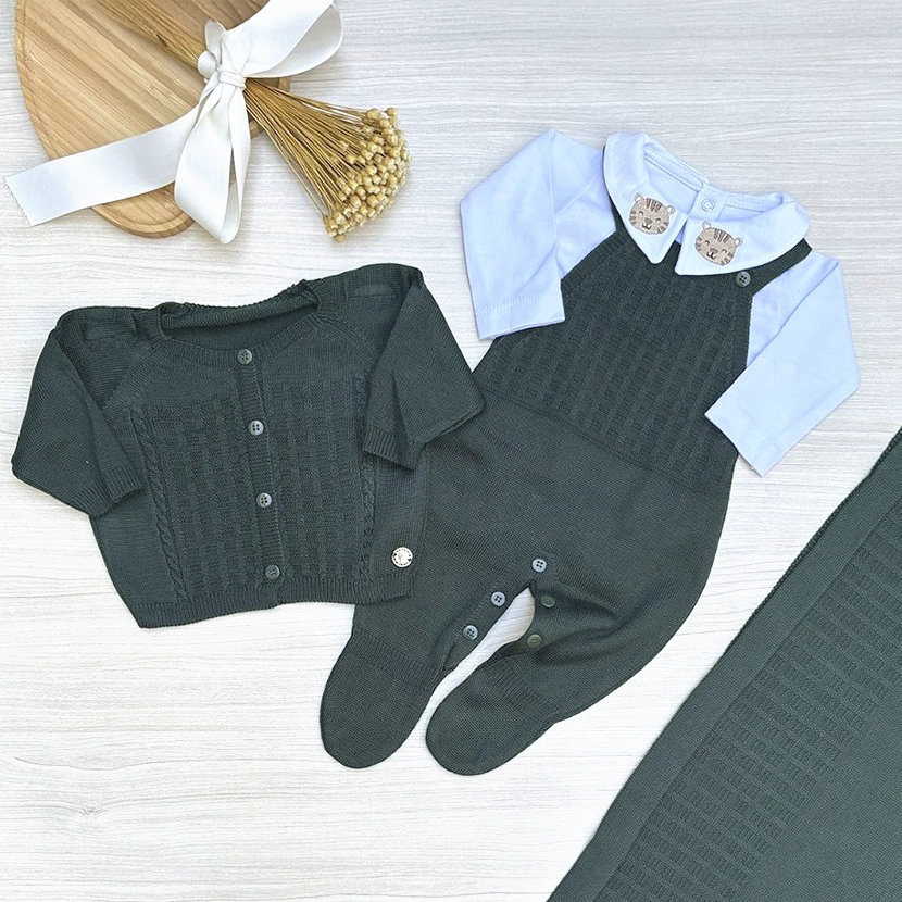 O macacão em tricot apresenta detalhes trabalhados e fechamento funcional, facilitando as trocas no dia a dia. O body manga longa com gola bordada adiciona charme e sofisticação ao visual, enquanto o casaco em tricot complementa o conjunto com aconchego e estilo. A manta coordenada finaliza o kit, sendo ideal para envolver o bebê com segurança e conforto.