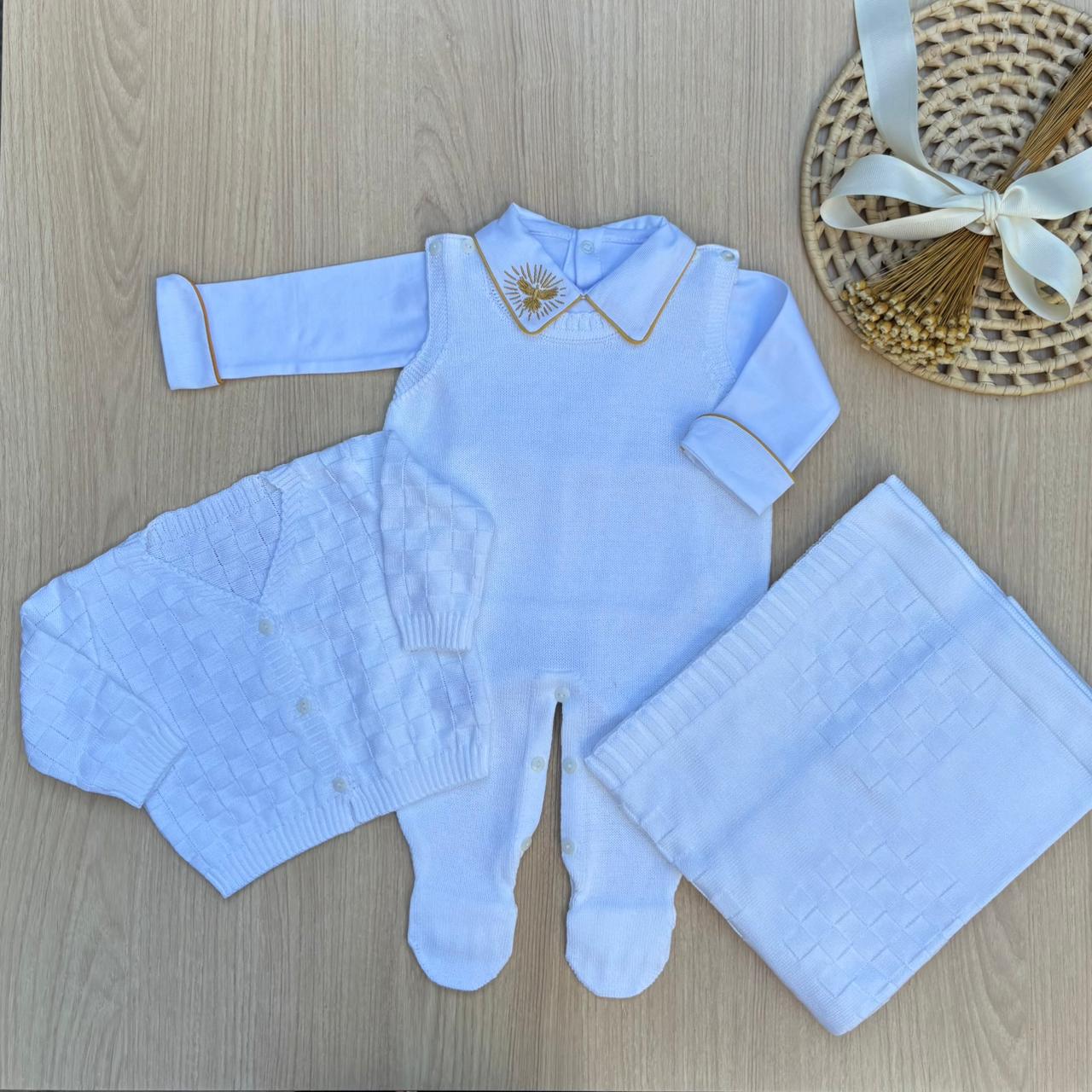 Um conjunto encantador, sofisticado e confortável, perfeito para tornar o batizado do seu bebê ainda mais especial.