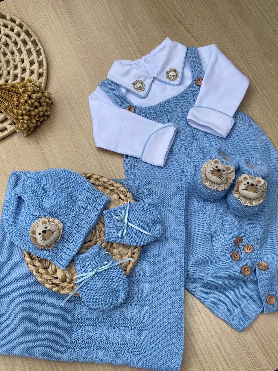 Para completar o visual, o kit inclui acessórios temáticos que combinam perfeitamente entre si: manta coordenada, touquinha com aplicação de leão e luvas em tricot, além de sapatinhos temáticos com o mesmo bichinho.