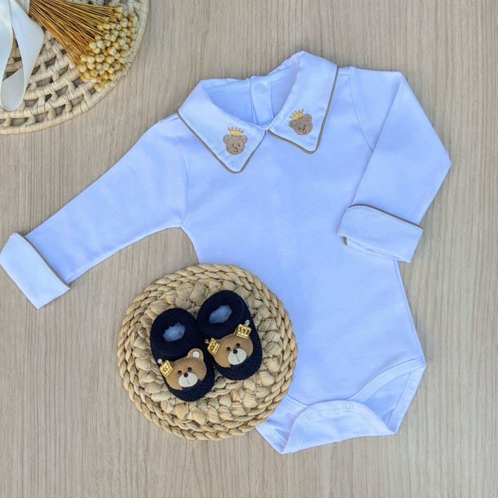 O conjunto é composto por body de manga longa com gola bordada de ursinho príncipe e sapatinhos em tricot combinando, criando uma proposta elegante, confortável e perfeita para maternidade, batizado, primeiros passeios e sessões de fotos.