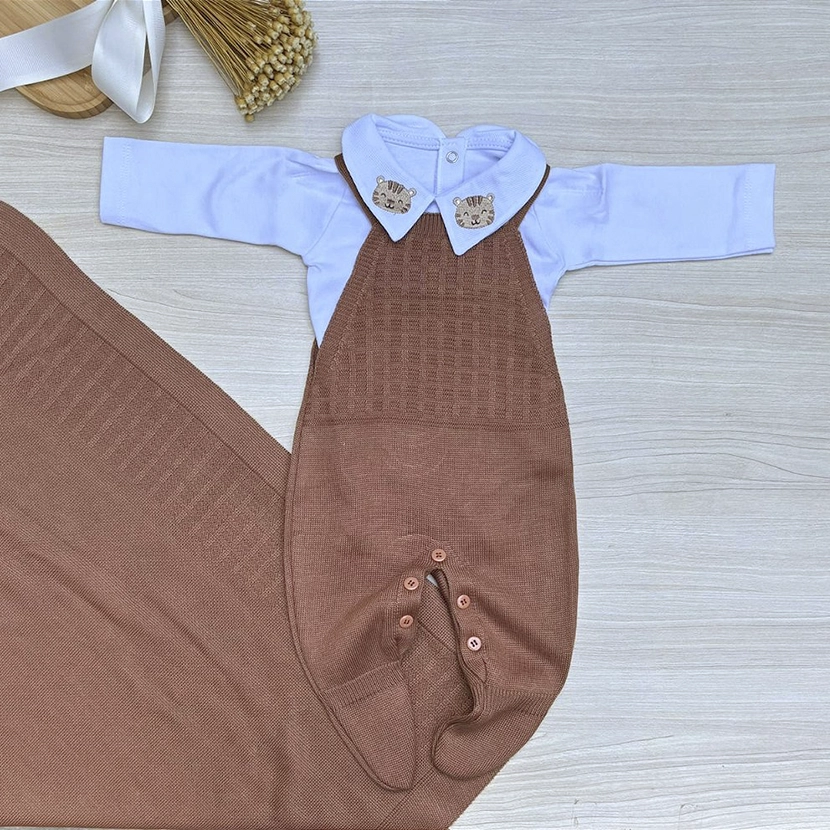 O conjunto conta com macacão em tricot com trama trabalhada, manta coordenada e body manga longa com gola bordada, criando uma composição clássica, sofisticada e atemporal. O body em tecido macio complementa o visual com praticidade e conforto, enquanto o macacão garante charme e aconchego desde a primeira troca.