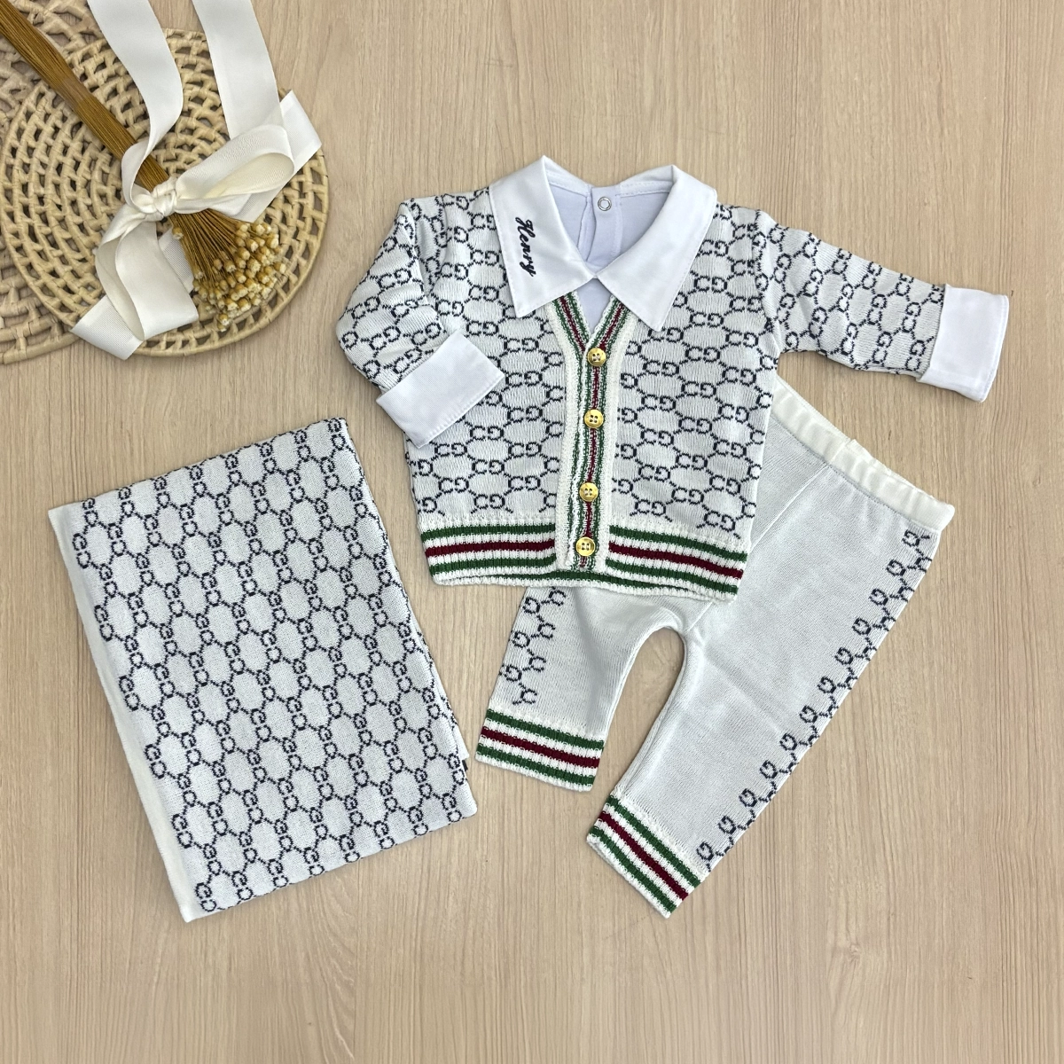 A saída de maternidade Dinhos Baby combina conforto com um estilo moderno, trazendo casaco em tricot, calça e manta coordenando perfeitamente. A personalização com nome na gola deixa a peça única e especial.