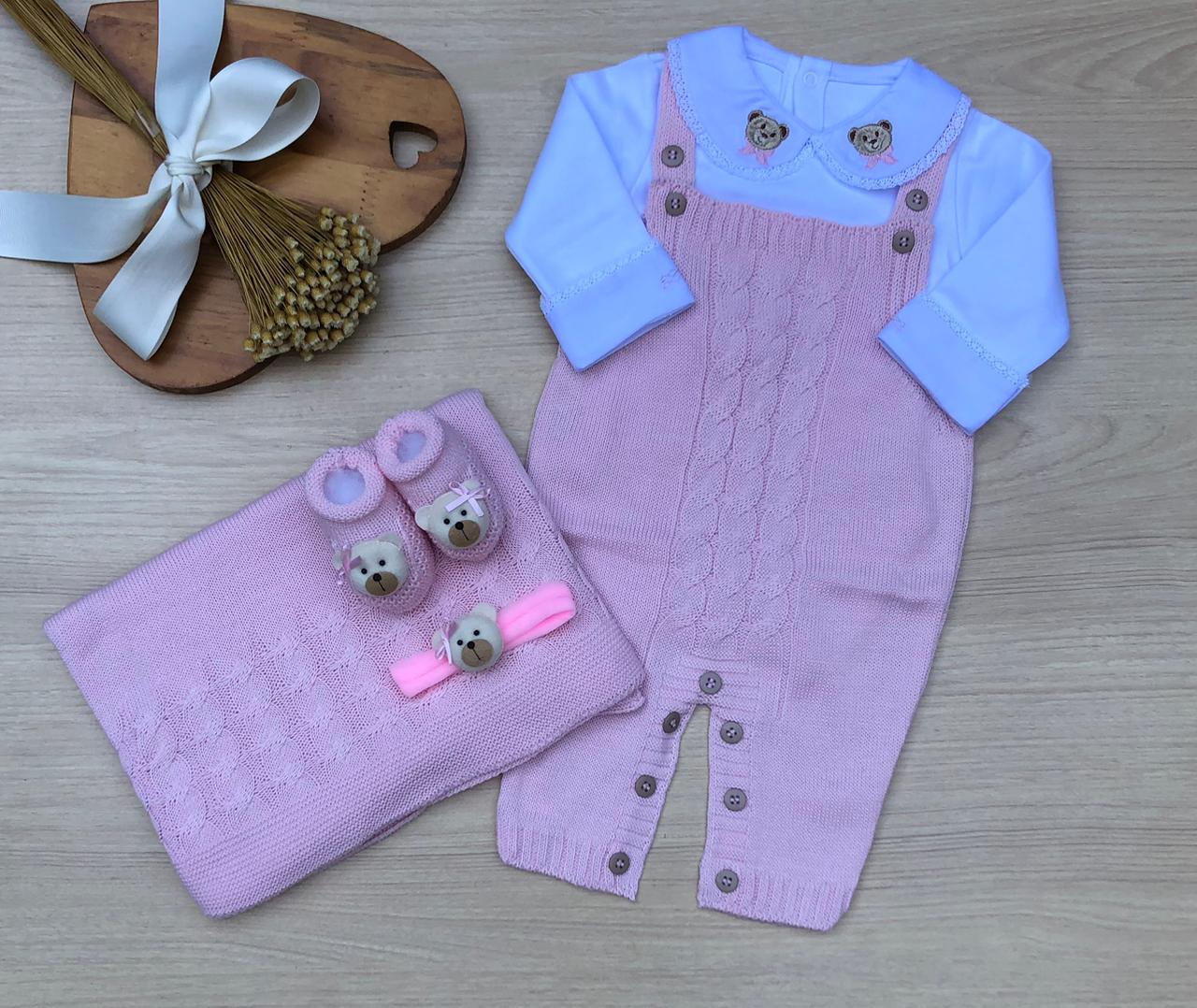 Acompanha manta combinando, sapatinhos com aplicação de ursinho e faixa de cabelo para deixar a pequena ainda mais charmosa nos primeiros registros da vida.