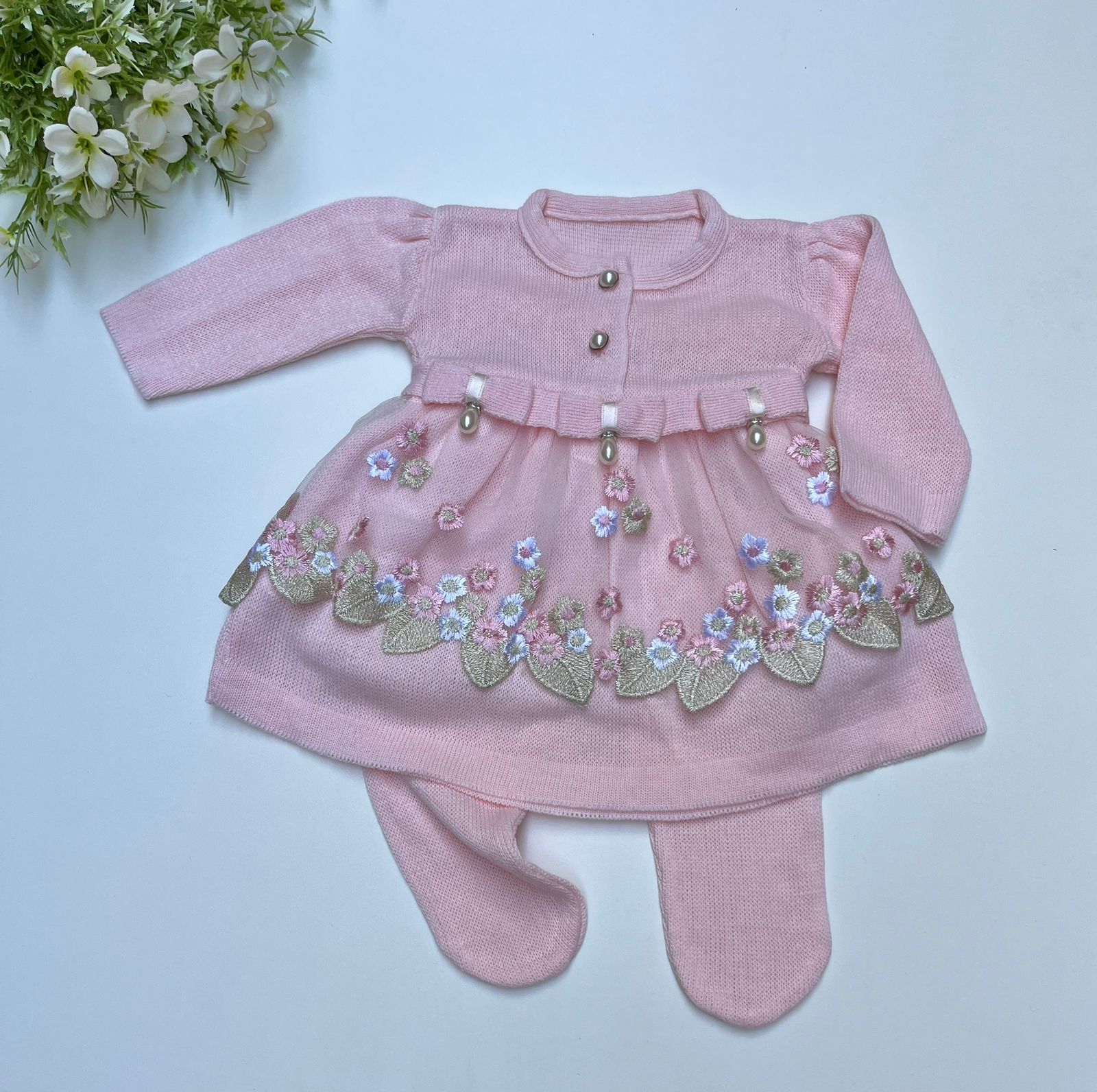 Saída de maternidade menina vestido rosê 3 peças em tricot, modelo lindo para a sua princesinha arrasar com o primeiro look, vestido rosê com rendas, pingentes, laços e manta ambas as peças versáteis podendo usar em várias ocasiões.