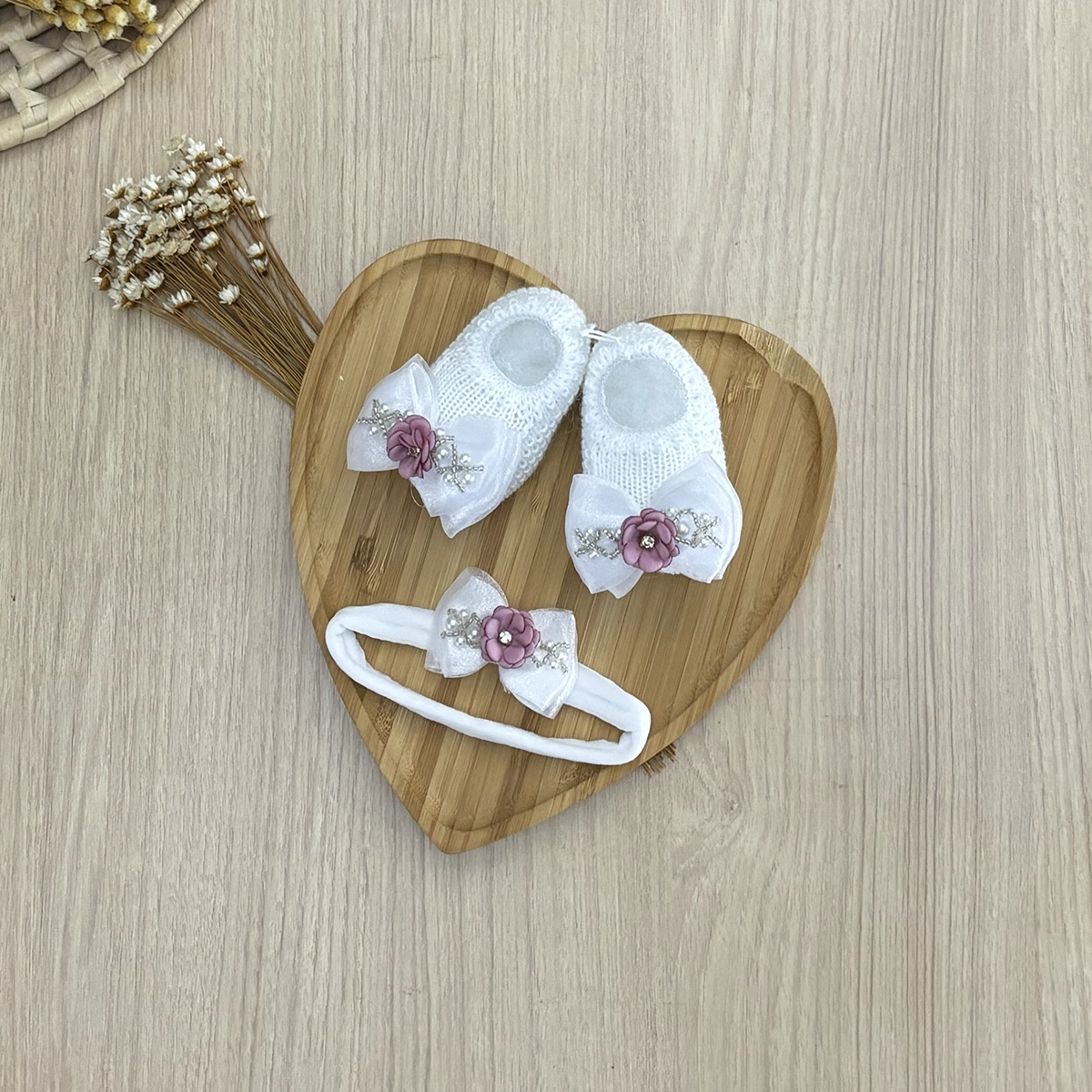 Produzido com material macio e confortável, garantindo cuidado e aconchego para os pezinhos da bebê. A faixinha complementa o conjunto, deixando a composição ainda mais harmoniosa e sofisticada.